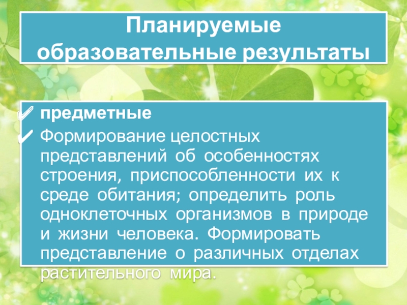 Планируемые образовательные результатыпредметныеФормирование целостных представлений об особенностях строения, приспособленности их к среде обитания; определить роль одноклеточных организмов