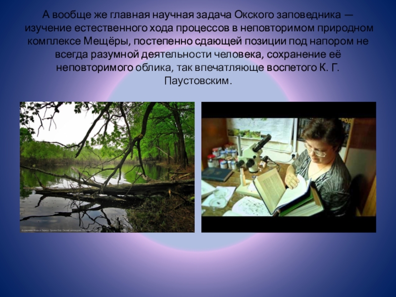 В Мещёрском крае нет никаких особенных красот и богатств, кроме лесов, лугов и прозрачного воздуха. Но все же край этот обладает большой притягательной силой. Он очень скромен - так же, как картины Левитана. Но в нем, как и в этих картинах, заключена вся прелесть и все незаметное на первый взгляд разнообразие русской природы.