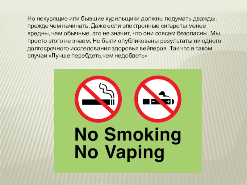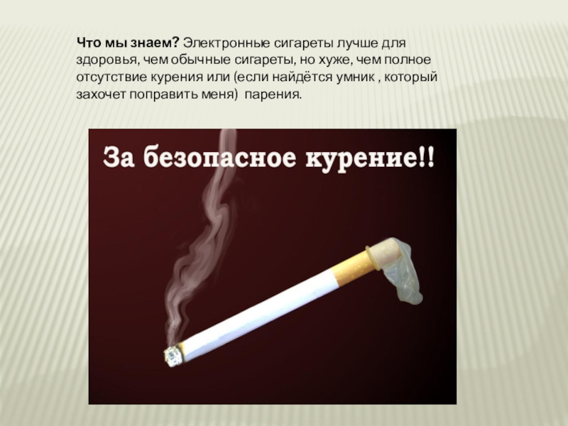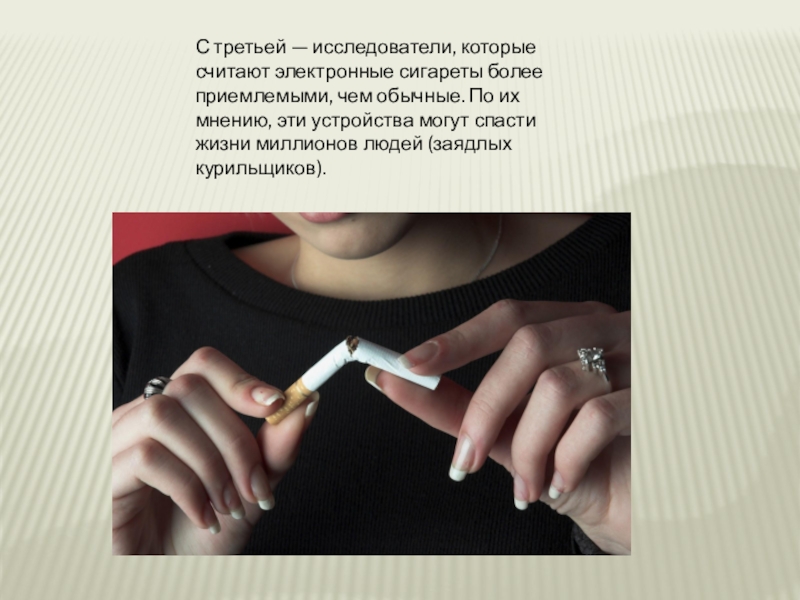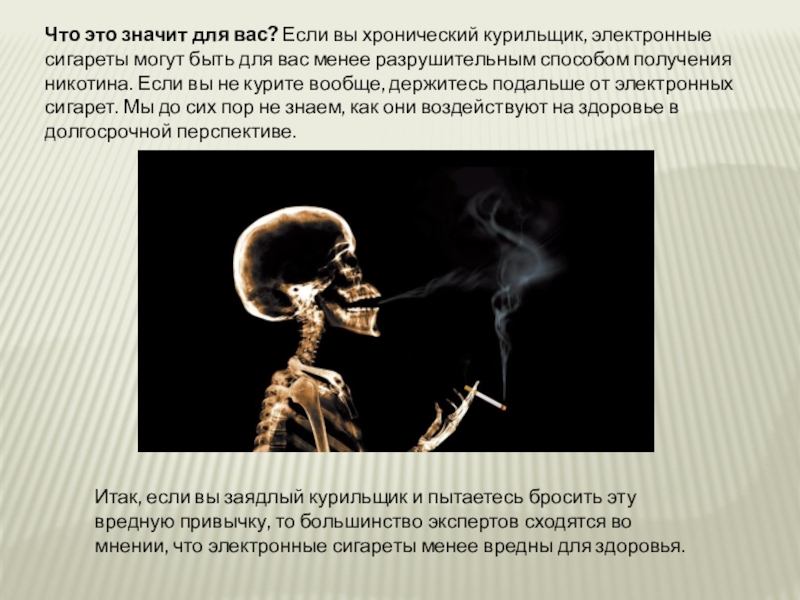 Итак, если вы заядлый курильщик и пытаетесь бросить эту вредную привычку, то большинство экспертов сходятся во мнении, что электронные сигареты менее вредны для здоровья.