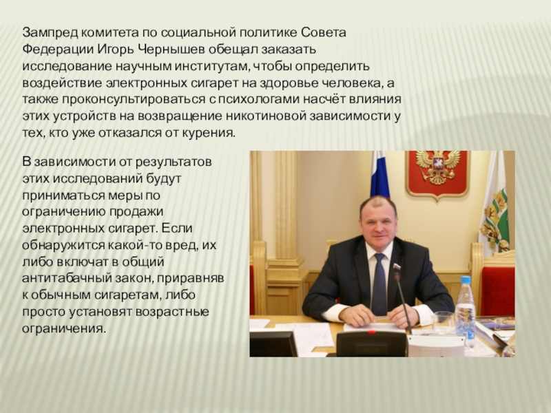 Зампред комитета по социальной политике Совета Федерации Игорь Чернышев обещал заказать исследование научным институтам, чтобы определить воздействие электронных сигарет на здоровье человека, а также проконсультироваться с психологами насчёт влияния этих устройств на возвращение никотиновой зависимости у тех, кто уже отказался от курения.
