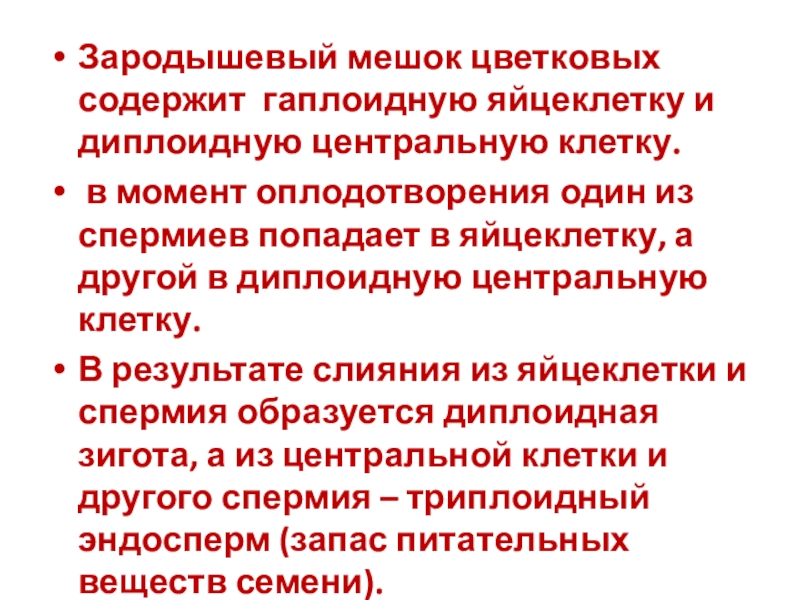 Зародышевый мешок цветковых содержит гаплоидную яйцеклетку и диплоидную центральную клетку. в момент оплодотворения один из спермиев попадает
