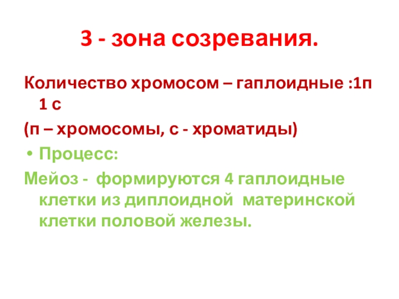 3 - зона созревания.Количество хромосом – гаплоидные :1п 1 с(п – хромосомы, с - хроматиды)Процесс:Мейоз - формируются