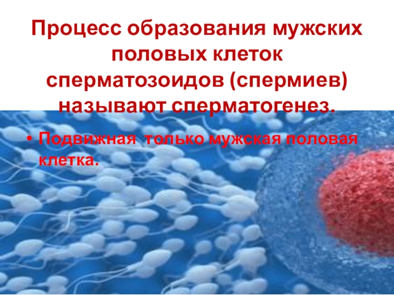 Процесс образования мужских половых клеток сперматозоидов (спермиев) называют сперматогенез.Подвижная только мужская половая клетка.