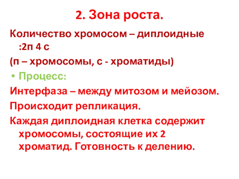 2. Зона роста. Количество хромосом – диплоидные :2п 4 с(п – хромосомы, с - хроматиды)Процесс:Интерфаза – между