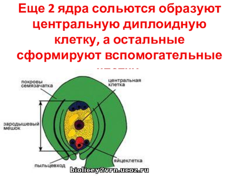 Слайд 22Еще 2 ядра сольются образуют центральную диплоидную клетку, а остальные сформируют