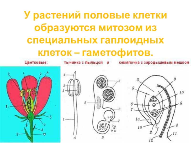 Слайд 15У растений половые клетки образуются митозом из специальных гаплоидных клеток –