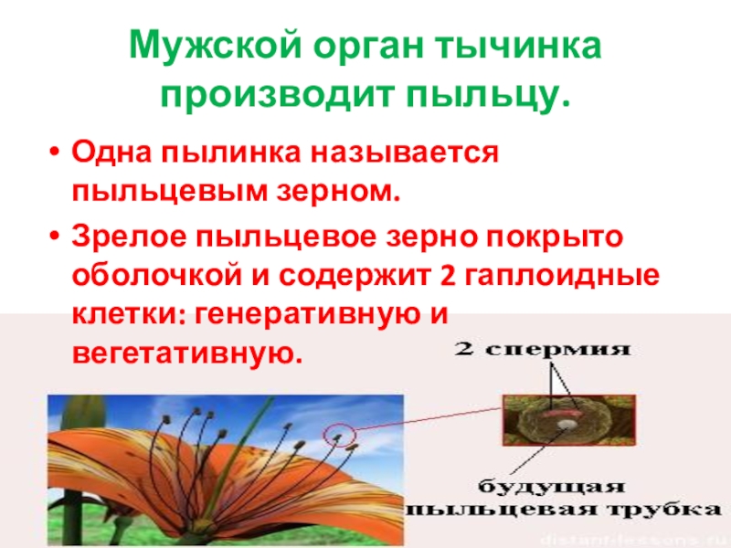 Мужской орган тычинка производит пыльцу.Одна пылинка называется пыльцевым зерном.Зрелое пыльцевое зерно покрыто оболочкой и содержит 2 гаплоидные