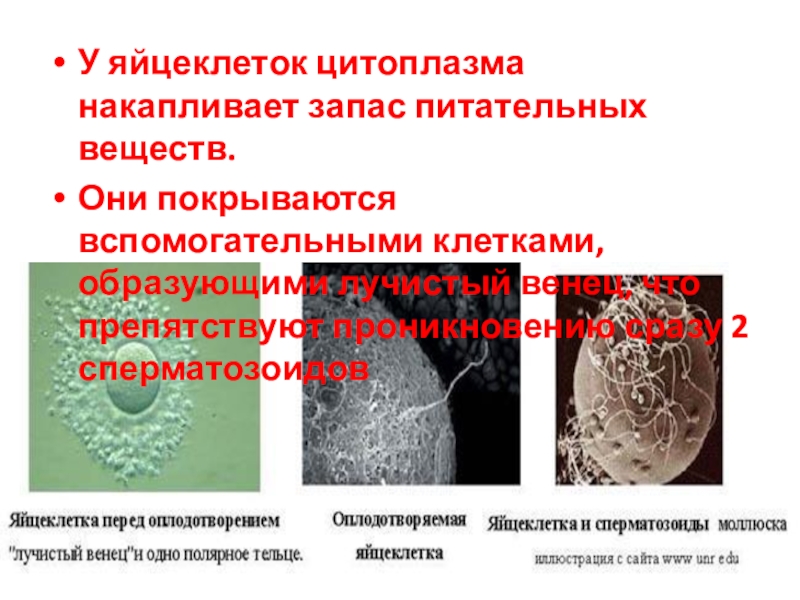 У яйцеклеток цитоплазма накапливает запас питательных веществ.Они покрываются вспомогательными клетками, образующими лучистый венец, что препятствуют проникновению сразу