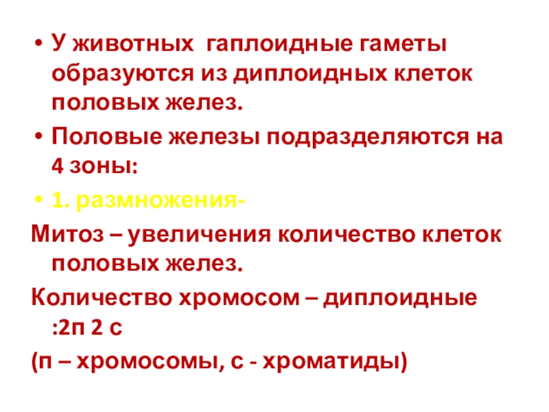 У животных гаплоидные гаметы образуются из диплоидных клеток половых желез.Половые железы подразделяются на 4 зоны:1. размножения-Митоз –