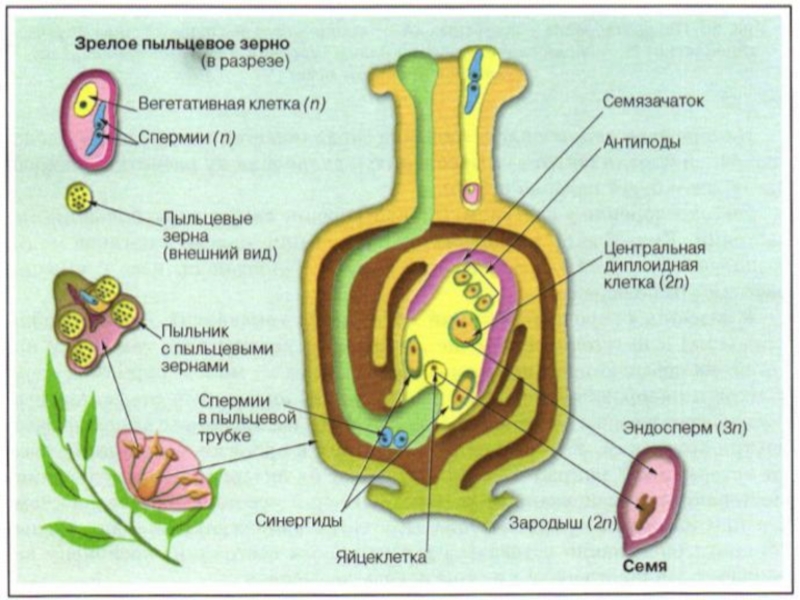 В результате слияния из яйцеклетки и спермия образуется диплоидная зигота, а из центральной клетки и другого спермия – триплоидный эндосперм (запас питательных веществ семени).