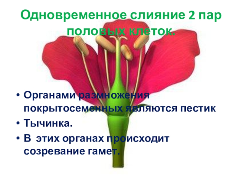 Одновременное слияние 2 пар половых клеток.Органами размножения покрытосеменных являются пестикТычинка.В этих органах происходит созревание гамет.