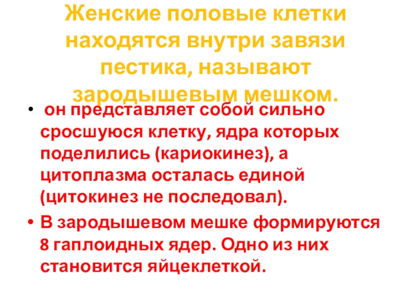 Слайд 21Женские половые клетки находятся внутри завязи пестика, называют зародышевым мешком.