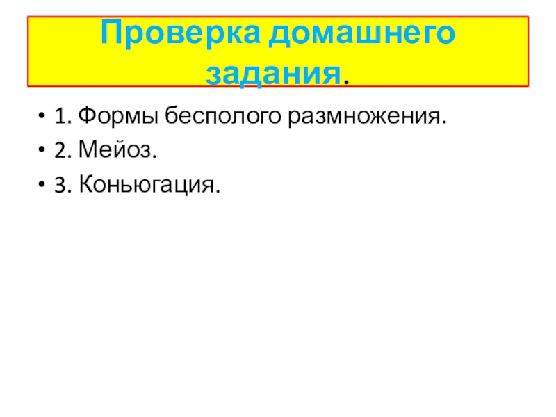Проверка домашнего задания.1. Формы бесполого размножения.2. Мейоз.3. Коньюгация.