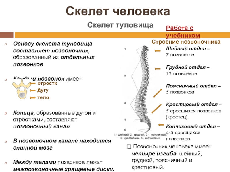четыре изгиба: шейный, грудной, поясничный и крестцовый.