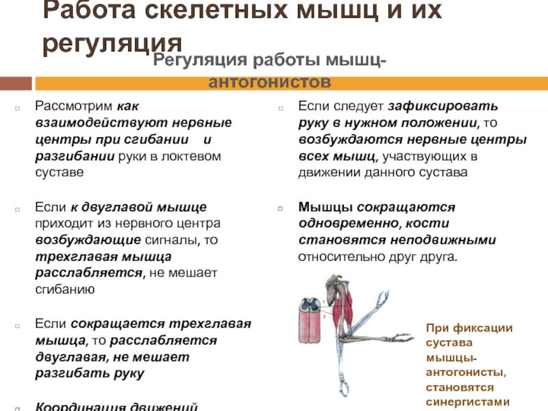 Если следует зафиксировать руку в нужном положении, то возбуждаются нервные центры всех мышц, участвующих в движении данного сустава