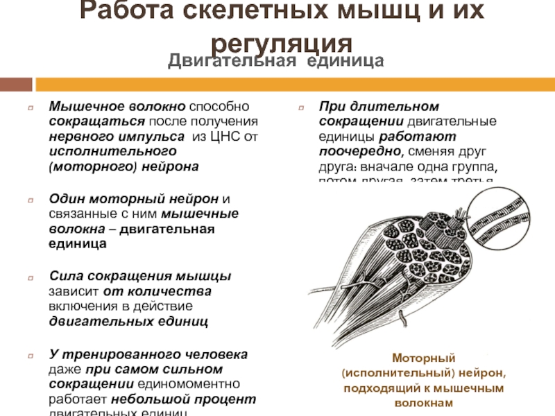 При длительном сокращении двигательные единицы работают поочередно, сменяя друг друга: вначале одна группа, потом другая, затем третья.