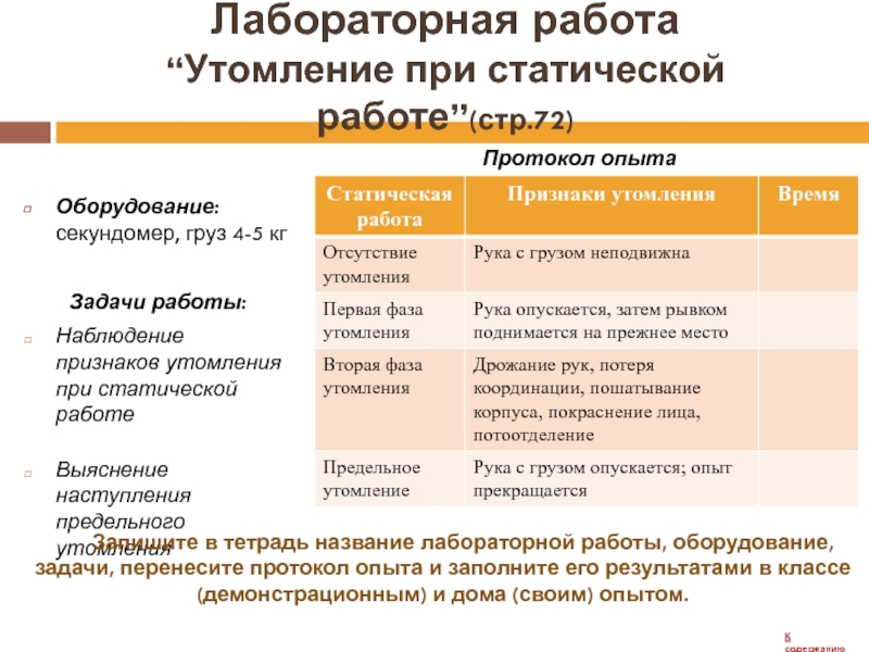 Запишите в тетрадь название лабораторной работы, оборудование, задачи, перенесите протокол опыта и заполните его результатами в классе (демонстрационным) и дома (своим) опытом.