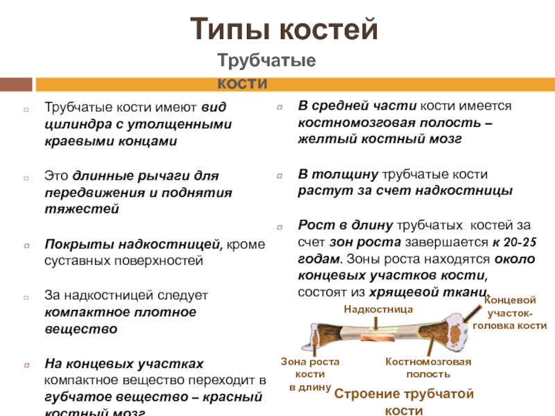 Трубчатые кости имеют вид цилиндра с утолщенными краевыми концами