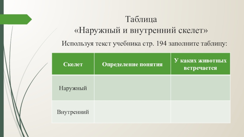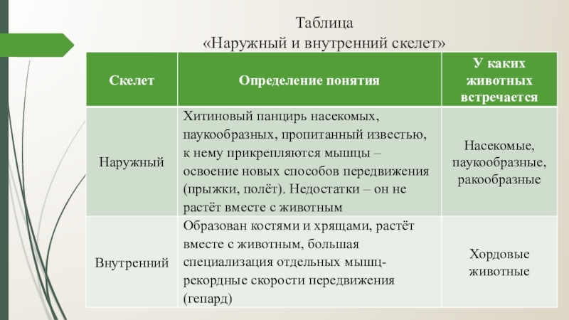 Слайд 5Таблица «Наружный и внутренний скелет»