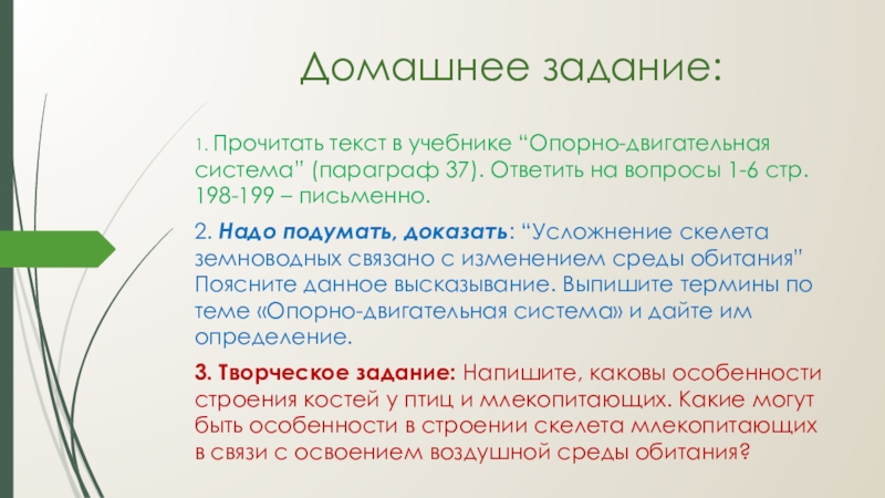 Домашнее задание:1. Прочитать текст в учебнике “Опорно-двигательная система” (параграф 37). Ответить на вопросы 1-6 стр. 198-199 –