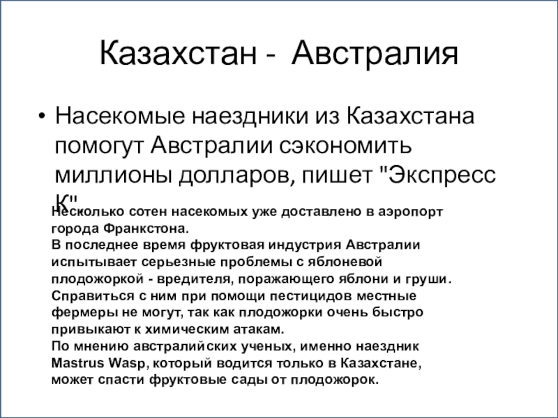 По мнению австралийских ученых, именно наездник Mastrus Wasp, который водится только в Казахстане, может спасти фруктовые сады от плодожорок.