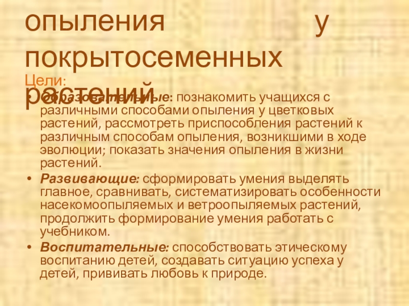 Образовательные: познакомить учащихся с различными способами опыления у цветковых растений, рассмотреть приспособления растений к различным способам опыления, возникшими в ходе эволюции; показать значения опыления в жизни растений.