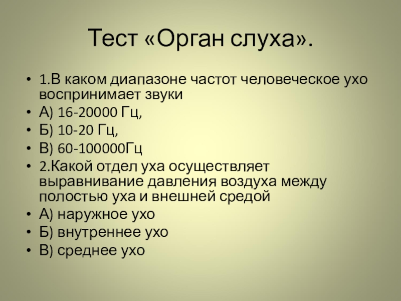 Тест «Орган слуха».1.В каком диапазоне частот человеческое ухо воспринимает звукиА) 16-20000 Гц, Б) 10-20 Гц,