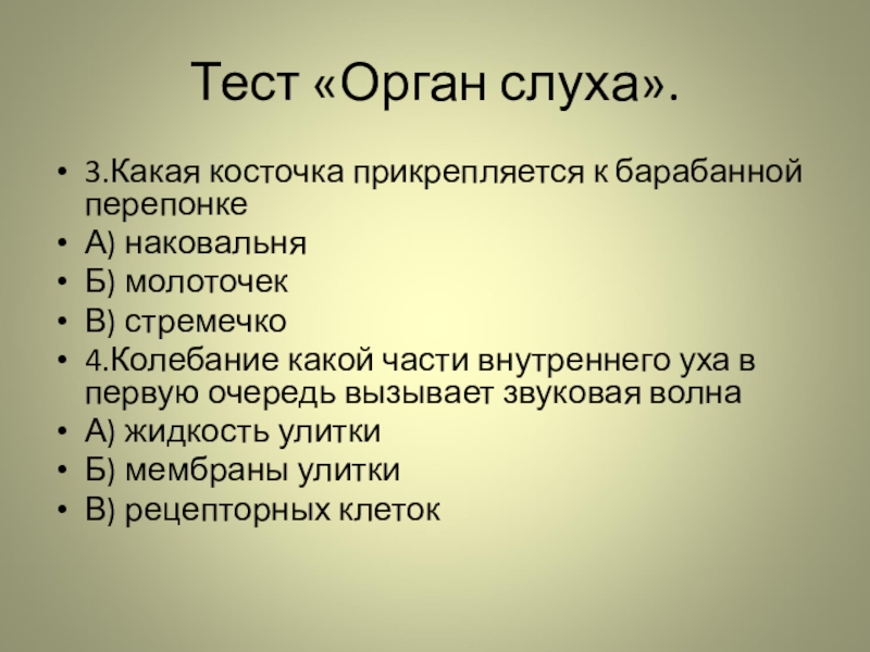 Тест «Орган слуха».3.Какая косточка прикрепляется к барабанной перепонкеА) наковальняБ) молоточекВ) стремечко4.Колебание какой части внутреннего уха в первую
