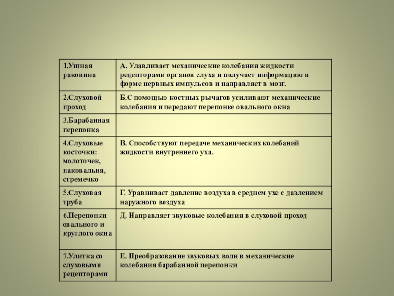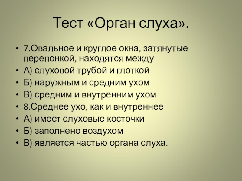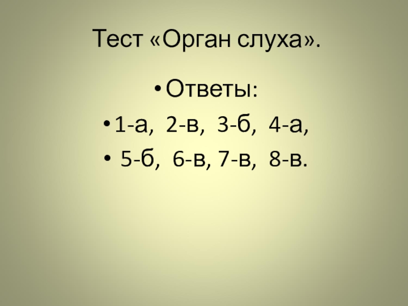 Тест «Орган слуха».Ответы: 1-а, 2-в, 3-б, 4-а, 5-б, 6-в, 7-в, 8-в.