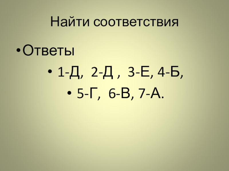 Найти соответствияОтветы 1-Д, 2-Д , 3-Е, 4-Б, 5-Г, 6-В, 7-А.