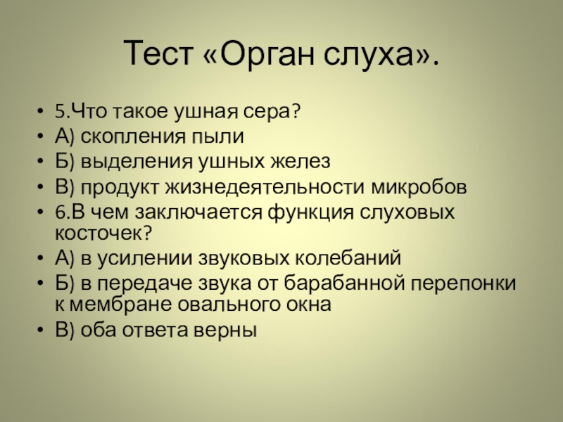 Тест «Орган слуха».5.Что такое ушная сера?А) скопления пылиБ) выделения ушных железВ) продукт жизнедеятельности микробов6.В чем заключается функция