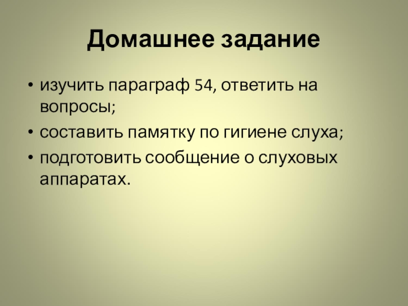 Домашнее заданиеизучить параграф 54, ответить на вопросы;составить памятку по гигиене слуха;подготовить сообщение о слуховых аппаратах.