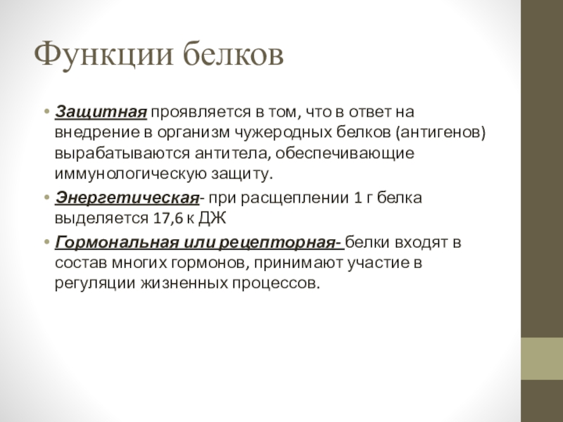 Функции белковЗащитная проявляется в том, что в ответ на внедрение в организм чужеродных белков (антигенов) вырабатываются антитела,