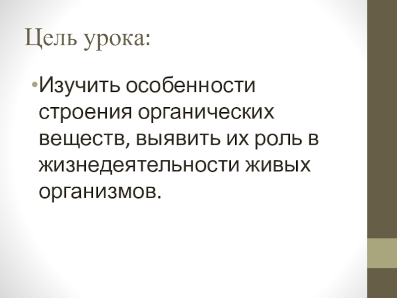 Изучить особенности строения органических веществ, выявить их роль в жизнедеятельности