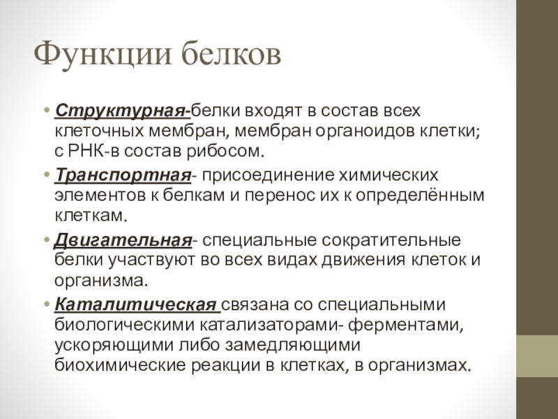 Функции белковСтруктурная-белки входят в состав всех клеточных мембран, мембран органоидов клетки; с РНК-в состав рибосом.Транспортная- присоединение химических