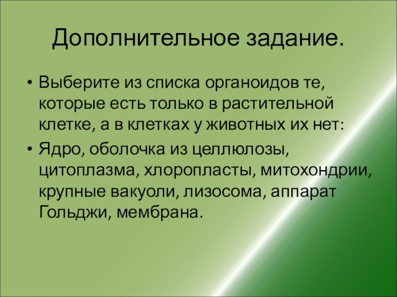 Дополнительное задание.Выберите из списка органоидов те, которые есть только в растительной клетке, а в клетках у животных