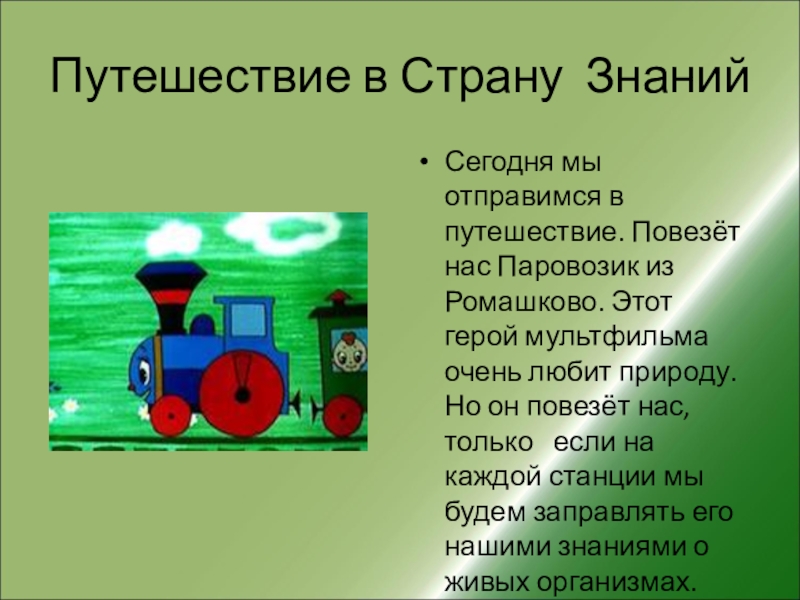 Путешествие в Страну ЗнанийСегодня мы отправимся в путешествие. Повезёт нас Паровозик из Ромашково. Этот герой мультфильма очень любит природу. Но он повезёт нас, только если на каждой станции мы будем заправлять его нашими знаниями о
