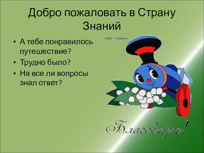 Добро пожаловать в Страну ЗнанийА тебе понравилось путешествие?Трудно было?На все ли вопросы знал ответ?