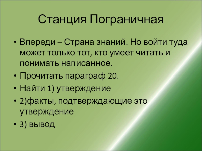 Станция ПограничнаяВпереди – Страна знаний. Но войти туда может только тот, кто умеет читать и понимать написанное.Прочитать