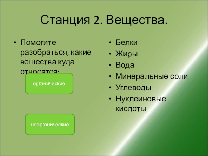Станция 2. Вещества.Помогите разобраться, какие вещества куда относятся:БелкиЖирыВодаМинеральные солиУглеводыНуклеиновые кислотынеорганическиеорганические