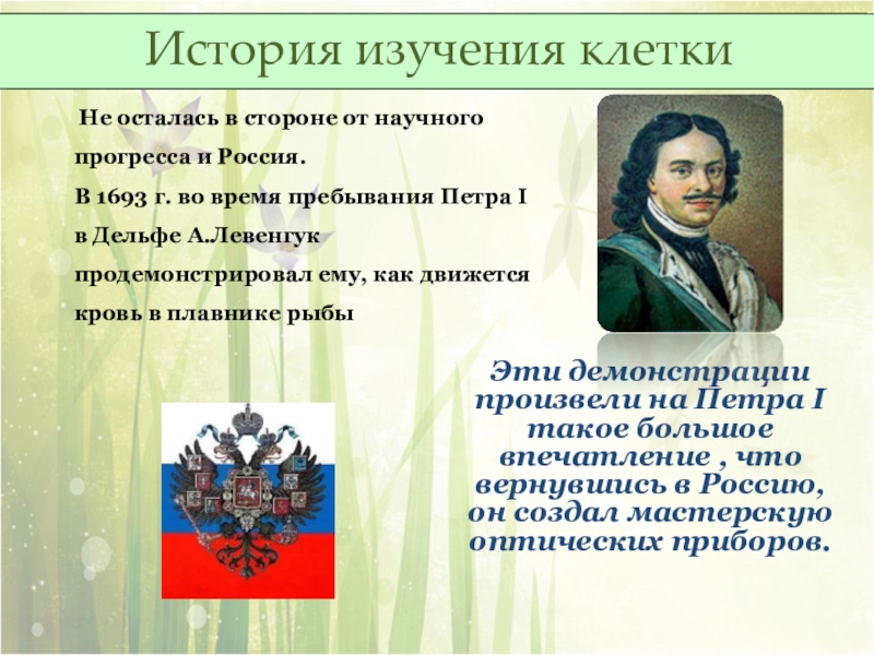 В 1693 г. во время пребывания Петра I в Дельфе А.Левенгук продемонстрировал ему, как движется кровь в плавнике рыбы