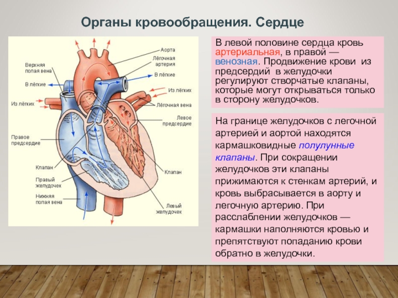 На границе желудочков с легочной артерией и аортой находятся кармашковидные полулунные клапаны. При сокращении желудочков эти клапаны прижимаются к стенкам артерий, и кровь выбрасывается в аорту и легочную артерию. При расслаблении желудочков — кармашки наполняются кровью и препятствуют попаданию крови обратно в желудочки.