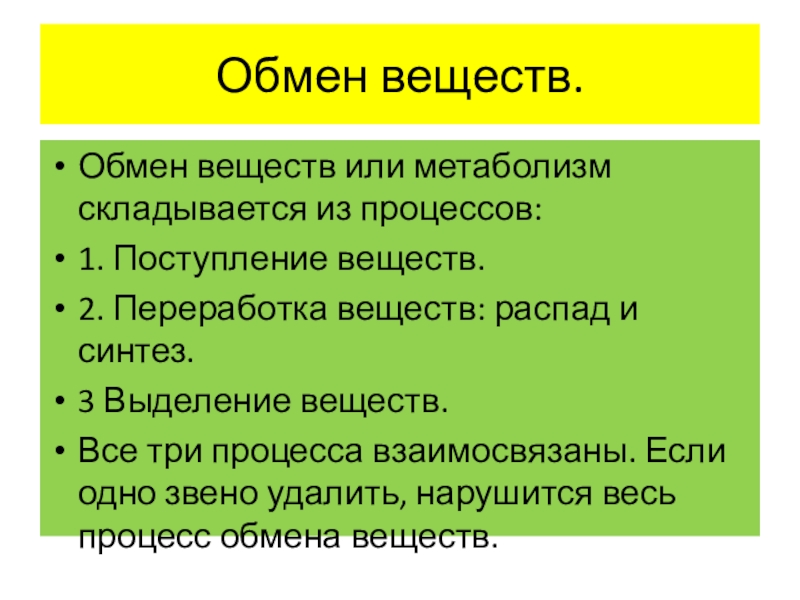 Обмен веществ.Обмен веществ или метаболизм складывается из процессов:1. Поступление веществ.2. Переработка веществ: распад и синтез.3 Выделение веществ.Все