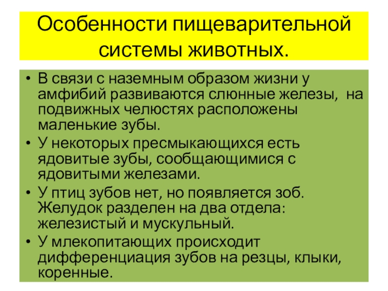 Особенности пищеварительной системы животных.В связи с наземным образом жизни у амфибий развиваются слюнные железы, на подвижных челюстях