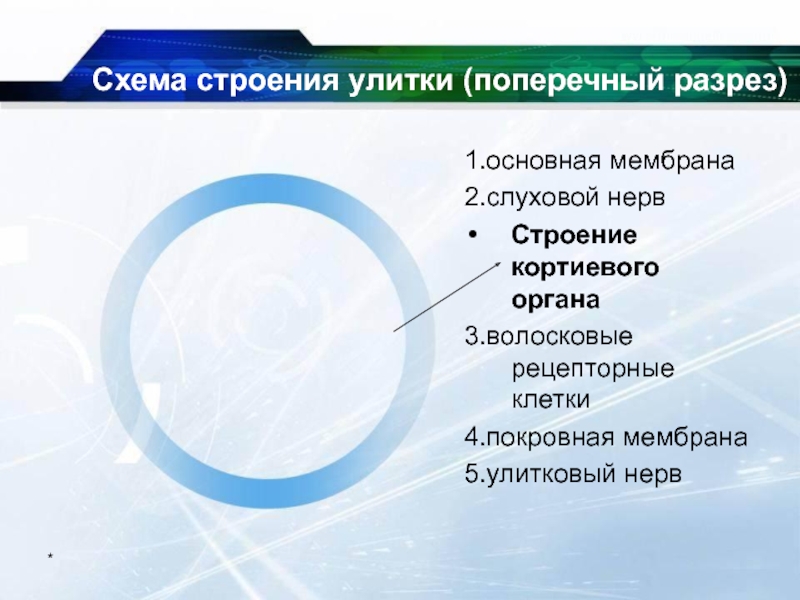 *Схема строения улитки (поперечный разрез)1.основная мембрана2.слуховой нервСтроение кортиевого органа3.волосковые рецепторные клетки4.покровная мембрана5.улитковый нерв