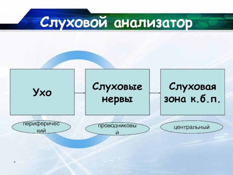 *Слуховой анализаторУхо Слуховые нервыСлуховая зона к.б.п.периферическийпроводниковыйцентральный