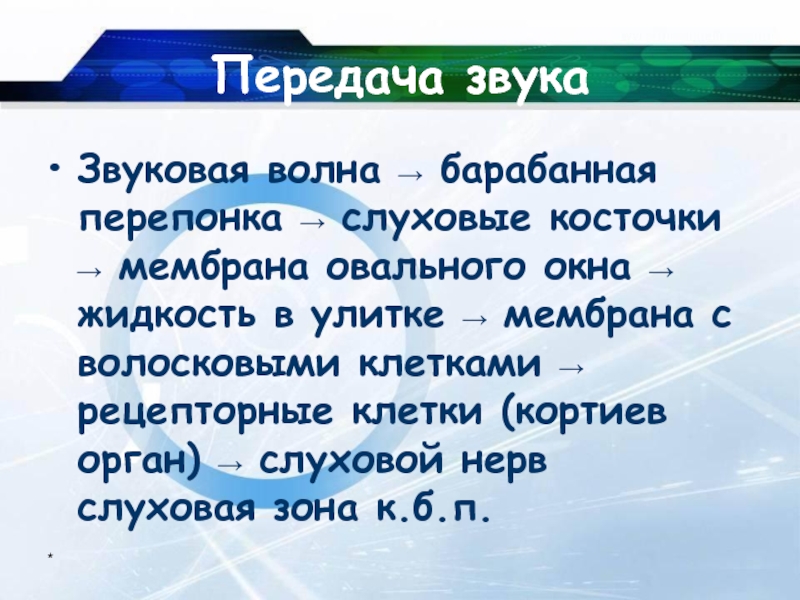 *Передача звукаЗвуковая волна → барабанная перепонка → слуховые косточки → мембрана овального окна → жидкость в улитке