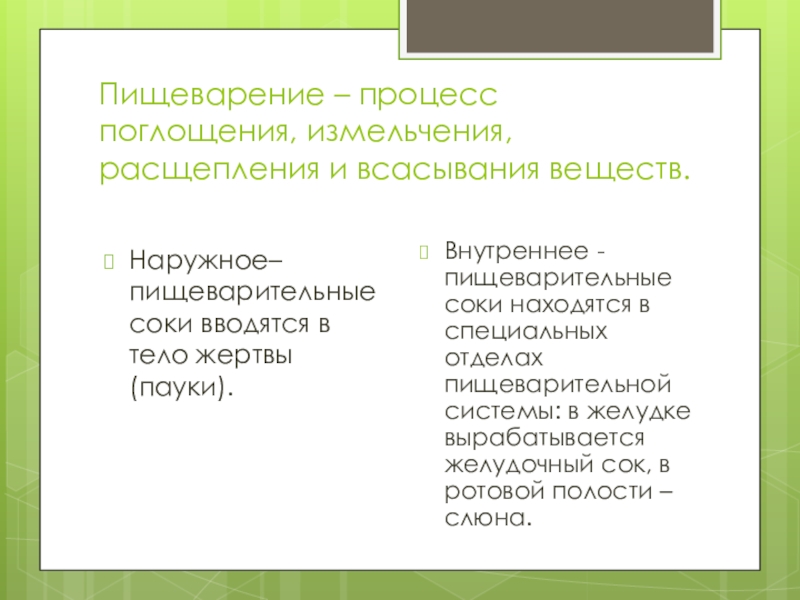 Внутреннее - пищеварительные соки находятся в специальных отделах пищеварительной системы: в желудке вырабатывается желудочный сок, в ротовой полости – слюна.