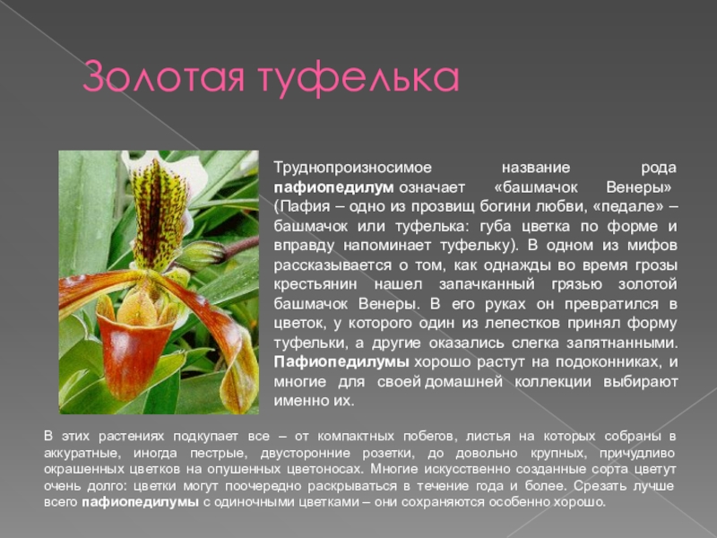 Венерин башмачок- многолетние растение, высотой 15-25см. С ползучим корневищем. Имеет