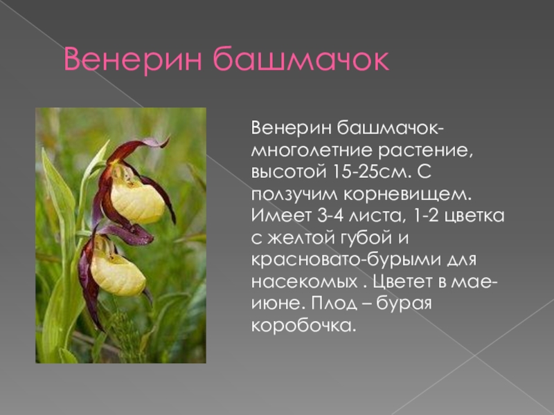 Венерин башмачокВенерин башмачок- многолетние растение, высотой 15-25см. С ползучим корневищем. Имеет 3-4 листа, 1-2 цветка с желтой губой и красновато-бурыми для насекомых . Цветет в мае-июне. Плод – бурая коробочка.